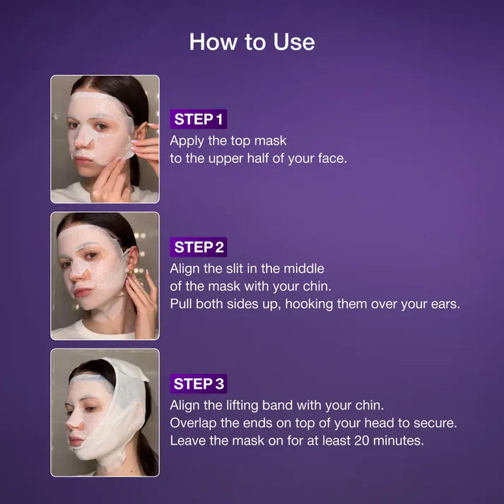 - [HOW TO USE] 1. Start by unfolding the top mask and aligning the eye holes with your eyes. 2. Align the slit in the middle of the bottom mask with your chin, then lift both ends and hook them over your ears. Adjust the intensity of the lower mask by choosing between the two ear slits. 3. Gently smooth the mask down over the chin area 4. For enhanced lifting, position the lifting band under your chin, gently pull up both sides, and secure them by overlapping at the top of your head. 5. Leave the mask on for at least 20 minutes to optimize radiance and lifting effects.