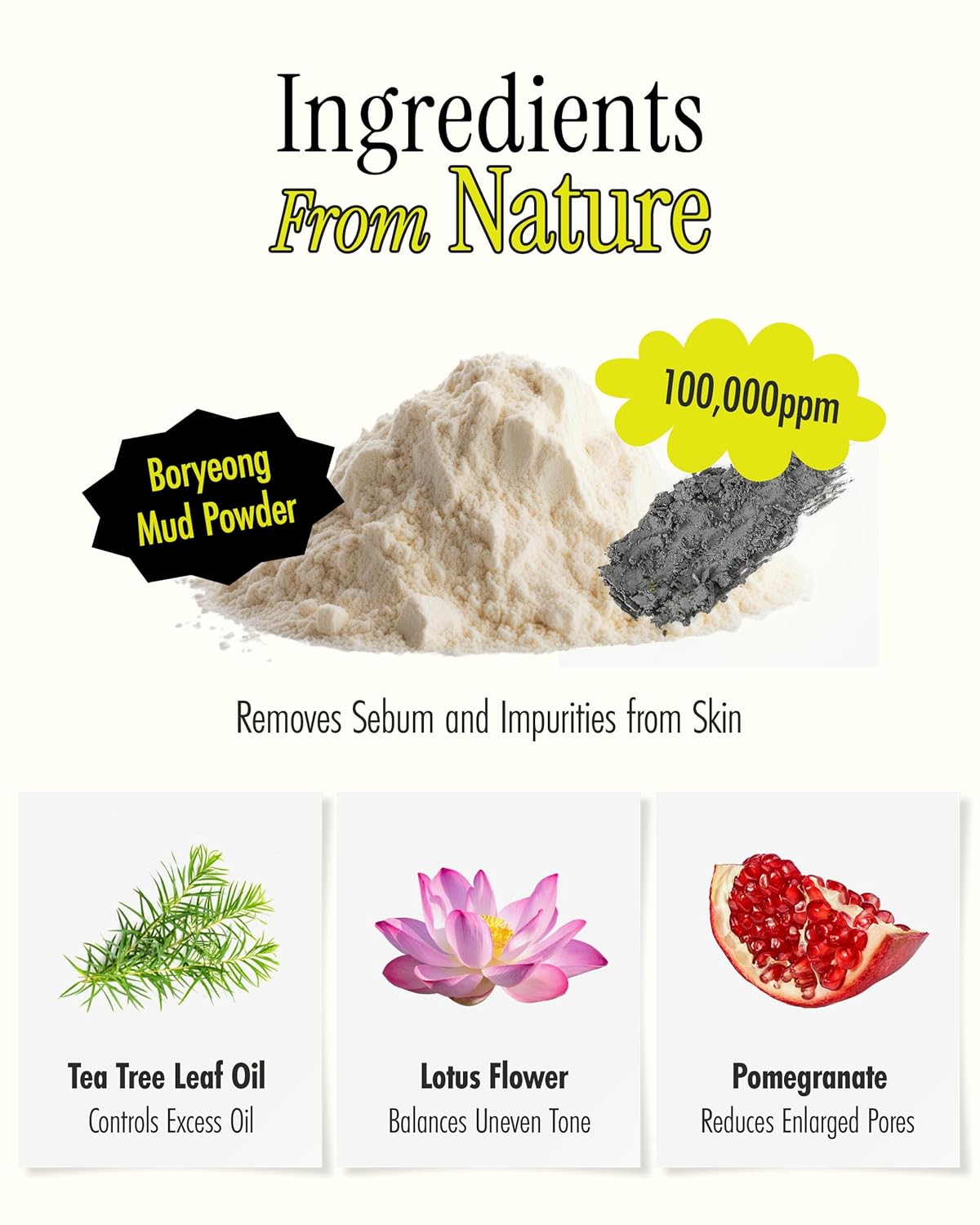 - PORE-PURIFYING KOREAN MUD. Microfine Boryeong Mud Powder 100,000 ppm (1–2μm) absorbs excess oil and impurities trapped in pores, leaving skin feeling clean and refreshed. The 14,000-mesh ground pure mud powder in this Korean face mask stick ensures smooth, even application.