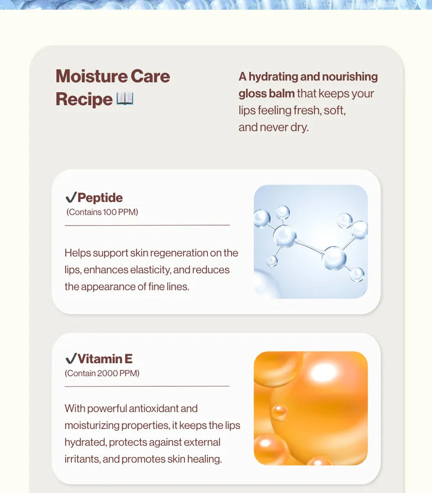 Formulated with 100ppm Peptide, 2000ppm Vitamin E, and Vitamin C to nourish, protect, and brighten lips.